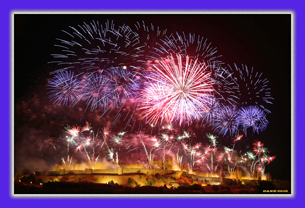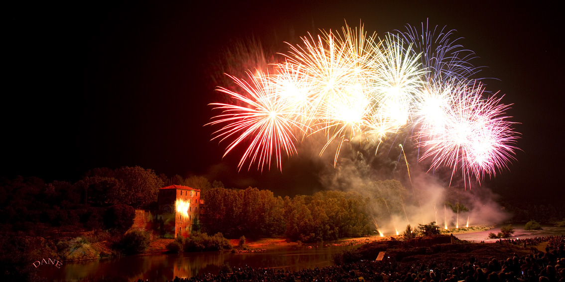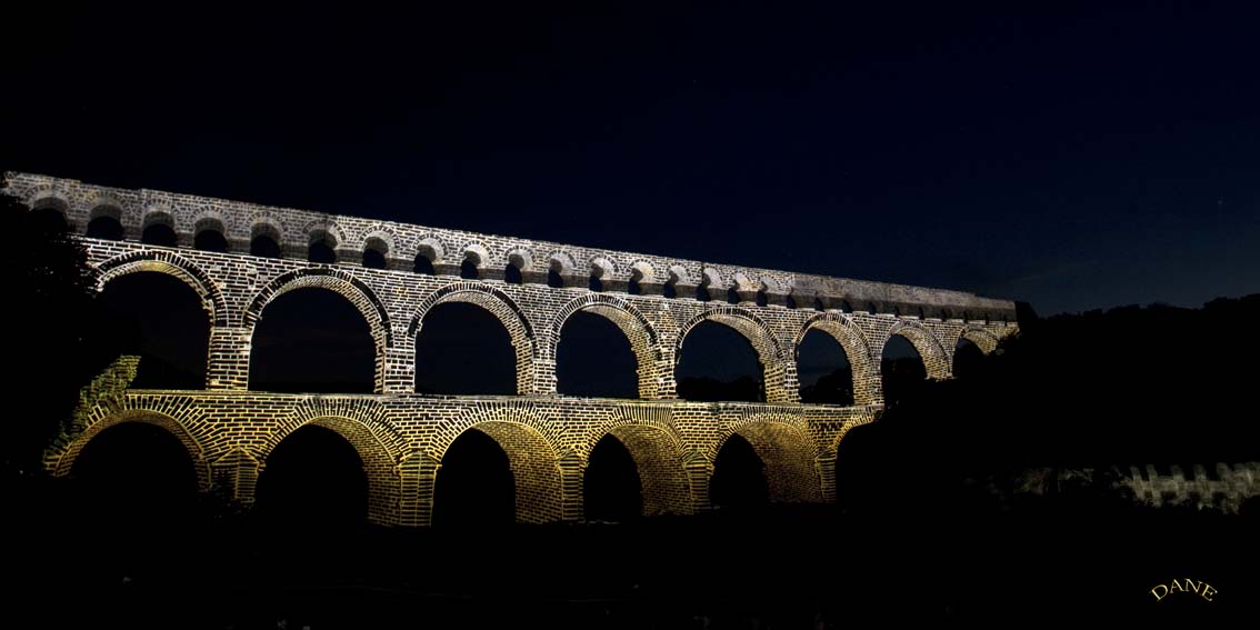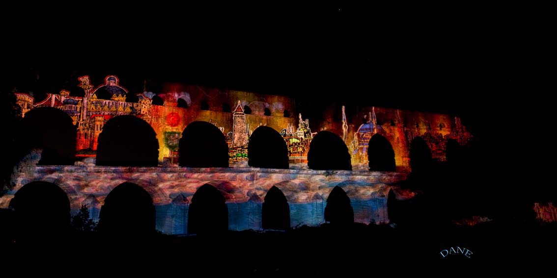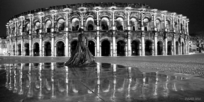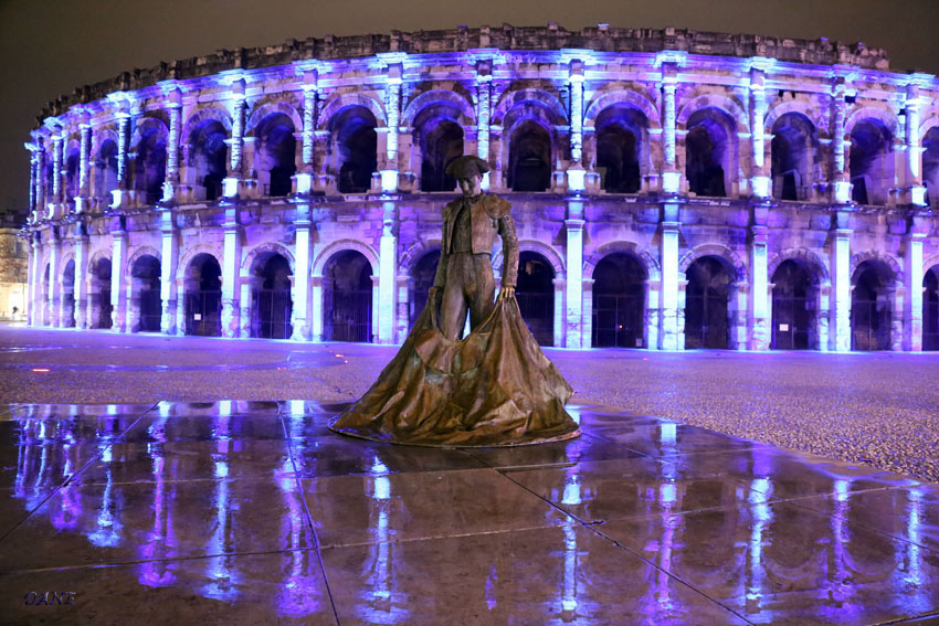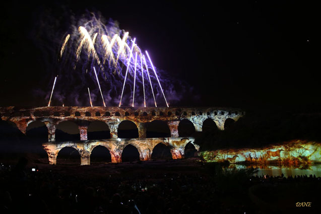 Le Gard avec les arènes, bâtiments et l’aqueduc en fête:
